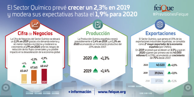 El sector químico prevé incrementar su cifra de negocios un 2,3% en 2019 y modera sus expectativas de crecimiento en 2020 hasta el 1,9%