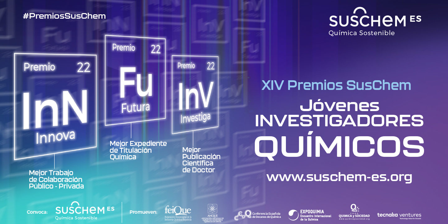 - La Plataforma Tecnológica y de Innovación de Química Sostenible SusChem España ha abierto la convocatoria de sus XIV Premios SusChem en tres categorías: Futura, Innova e Investiga, en reconocimiento del trabrajo y el talento de los jóvenes investigadores españoles en diferentes ámbitos de la química.