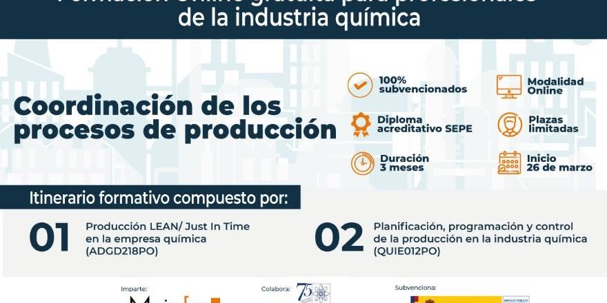 Organizada por el Grupo Mainjobs, en colaboración con ANQUE, se presenta el curso formativo para profesionales de la industria química: “Coordinación de los procesos de producción”, modalidad online. Esta iniciativa es completamente gratuita, no consume crédito de formación de las empresas y está subvencionada por el SEPE, en el marco de la convocatoria de programas de formación de ámbito estatal del sector de Industrias Químicas.