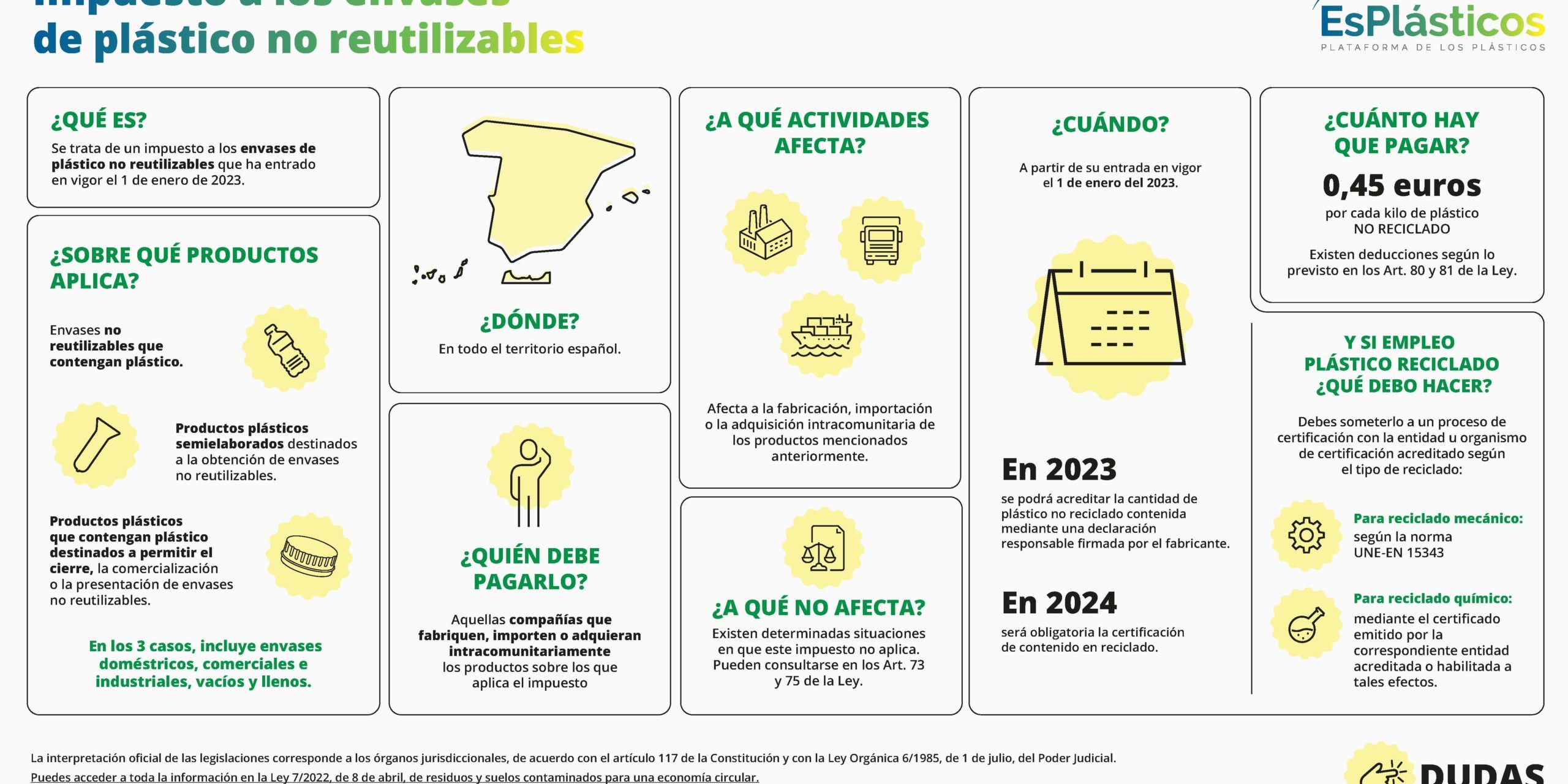 Algunas de las peticiones que hacen las empresas del sector a hacienda es que, de mantenerse esta obligación, debe haber un traspaso a los envasadores para mejorar el control y trazabilidad y evitar así los fraudes. Otras de las peticiones sugeridas es la correcta transmisión del impuesto, o que sea finalista, además de formar a las empresas, dada la dificultad y teniendo en cuenta que el 98% del sector de plásticos son pymes y micropymes lo cual conlleva pocos recursos.