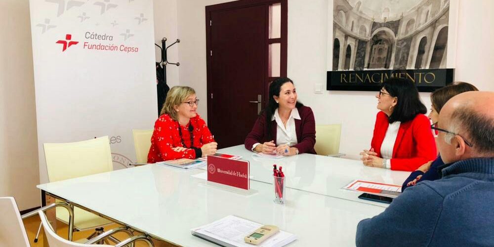 La rectora de la Universidad de Huelva, María Antonia Peña, junto con la vicerrectora de Innovación y Empleabilidad, Isabel Rodríguez; la directora de la Cátedra Fundación Cepsa, Inés Garbayo, y la responsable de la Fundación Cepsa en Huelva, Teresa Millán, han presentado la memoria de actividades 2018 de la Cátedra Fundación Cepsa, que ambas entidades crearon en 2003 con el nombre de Cátedra Cepsa, con el objetivo de canalizar de una manera más efectiva el conjunto de colaboraciones que venían realizando.
