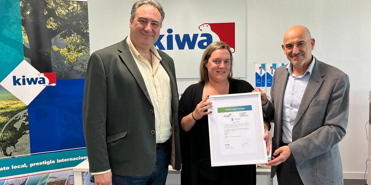 Las familias de compuestos de PVC, Etinox F y Etinox X, producidos en la fábrica de Monzón (Huesca) de Ercros, han sido certificadas con el sello VinylPlus supplier. El jefe de línea de producto de compuestos de PVC y especialidades, Rafael Mancho, y la técnica de desarrollo sostenible de la fábrica, Aurélie Verne, han recogido el certificado de manos de Juan Cardona, director general de Kiwa en España, la empresa holandesa que lo ha expedido.