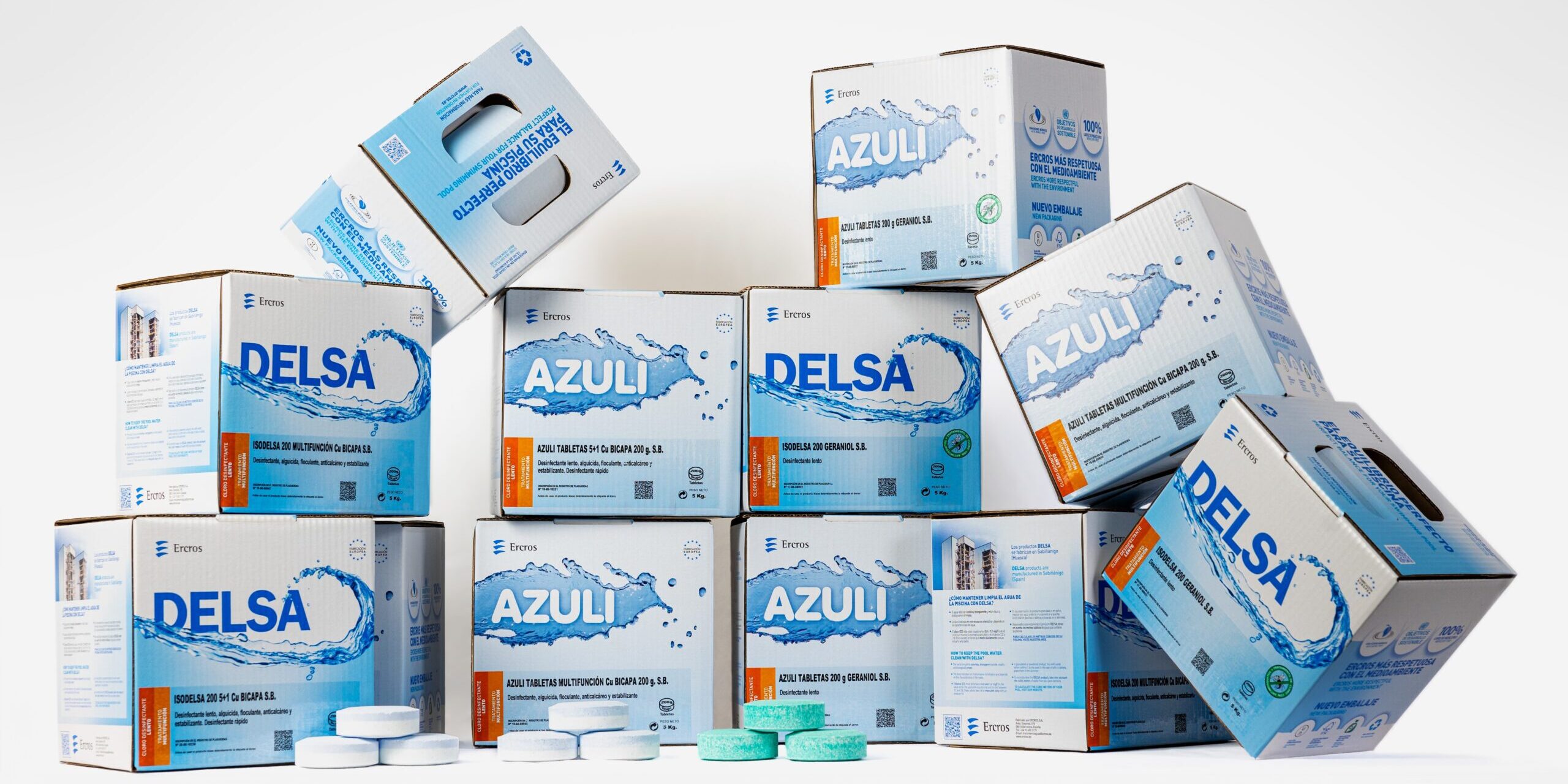 La innovadora caja de tabletas de cloro para el tratamiento del agua de piscinas lanzada por Ercros cuenta con la homologación UN, está fabricada con cartón procedente de fuentes responsables, es 100% reciclable y el material de su bolsa interior es de plástico reciclado.