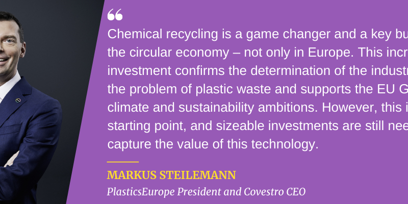 En su intervención en el evento «Closing the loop of chemical recycling in Europe» en Bruselas, Markus Steilemann, presidente de PlasticsEurope y director ejecutivo de Covestro, comentó: «El reciclaje químico marca un punto de inflexión y es un componente clave de la economía circular, no solo en Europa. Este aumento de la inversión confirma la determinación de la industria de abordar el problema de los residuos plásticos y respalda las ambiciones climáticas y de sostenibilidad del Green Deal de la UE. No obstante, esto es solo el punto de partida y aún se necesitan inversiones considerables para capturar el valor de esta tecnología en su totalidad«.